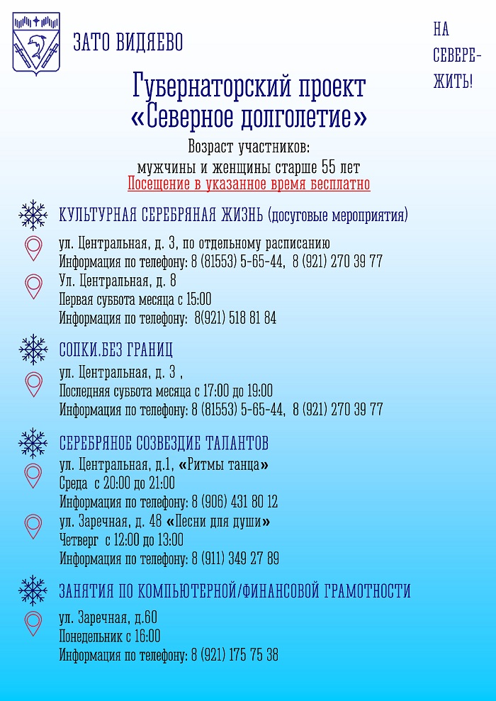 https://vk.ru/cokfregatВ ЗАТО Видяево в рамках стратегического плана «На Севере — жить!» реализуется проект «Северное долголетие», инициированный губернатором Мурманской области Андреем Чибисом. Целью проекта является создание условий для активной, насыщенной жизни северян старшего поколения.