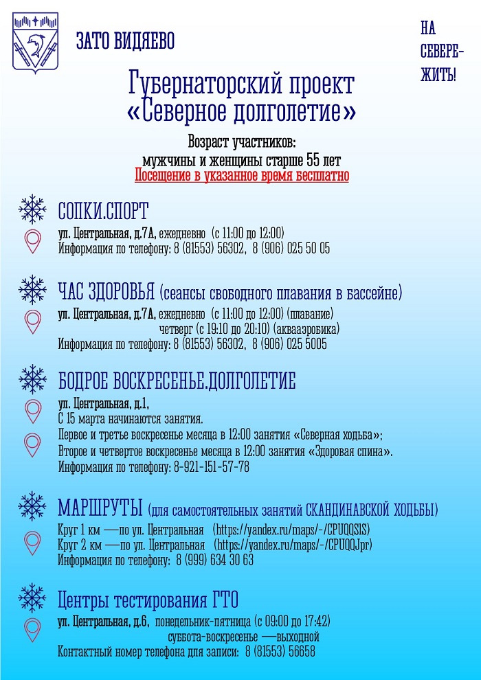 Проект «Северное долголетие» предлагает жителям старшего поколения (женщины и мужчины старше 55 лет) в ЗАТО Видяево бесплатные занятия спортом: